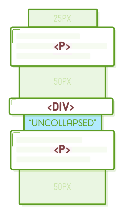 We'll delve further into the <div> element in the upcoming section. What's crucial to note here is that only consecutive elements can collapse into each other. Placing an element with a non-zero height (as indicated by the padding-top) between our paragraphs compels them to exhibit both the 25px top margin and the 50px bottom margin.