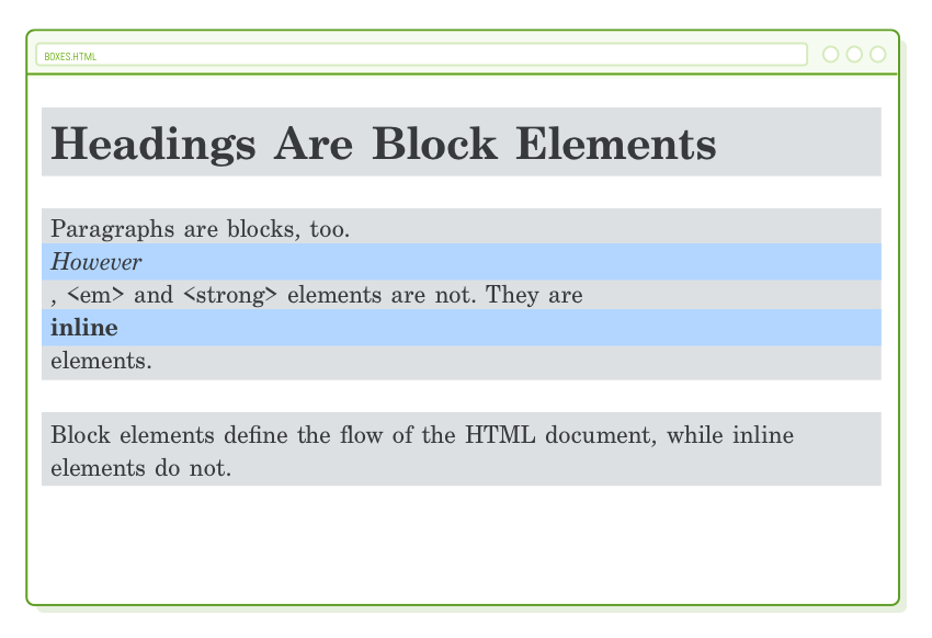At present, these elements behave similarly to our headings and paragraphs: they initiate on a separate line and occupy the full width of the browser. This proves beneficial when you intend to transform <a> elements into buttons or format <img/> elements (both of which are originally inline boxes).