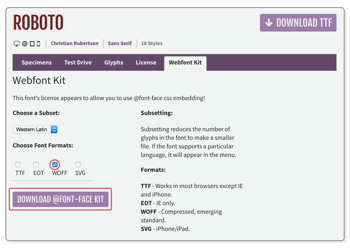 Now, let's acquire a web font. For our example, we're utilizing the free Roboto font, which you can obtain from Font Squirrel. Be sure to access the "Webfont Kit" tab instead of clicking the "Download TTF" button. Deselect all the formats except for WOFF, as that's the sole format we'll be using, and then proceed by clicking the "Download @font-face Kit" button.